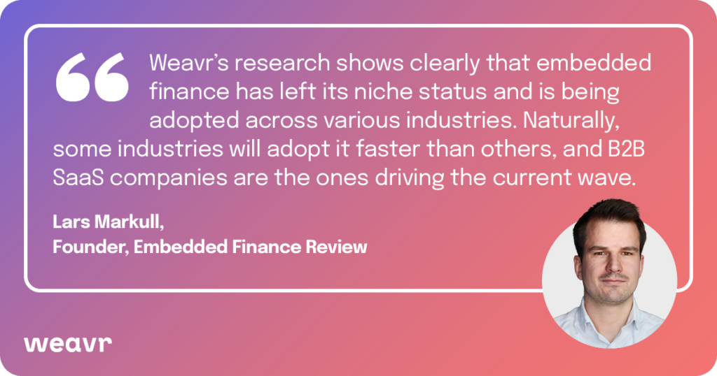 This picture has now changed, especially for B2B SaaS providers. The current rate of adoption suggests it is entering the mainstream. You could say embedded finance is coming out of adolescence, and our research shows that the industry recognises this change: